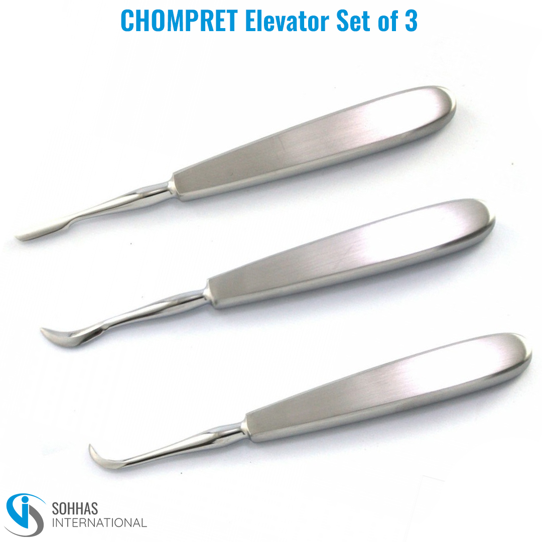 The CHOMPRET Elevator Set of 3 is a high-performance dental instrument set designed for the precise and controlled elevation of teeth and root fragments during extraction procedures. These elevators are particularly effective in accessing deep or difficult-to-reach areas, making them ideal for both routine and complex surgical extractions.