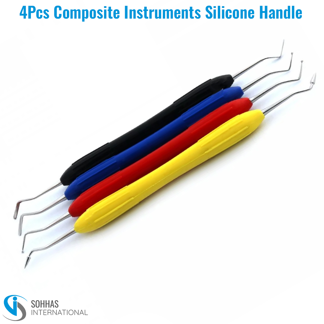 The 4Pcs Dental Composite Instruments Silicone Handle Set is a premium selection of dental tools designed for precise placement, shaping, and contouring of composite and resin materials during restorative and cosmetic procedures. Each instrument features a non-stick stainless steel tip to ensure smooth handling and clean application, minimizing material adhesion and maximizing procedural efficiency.