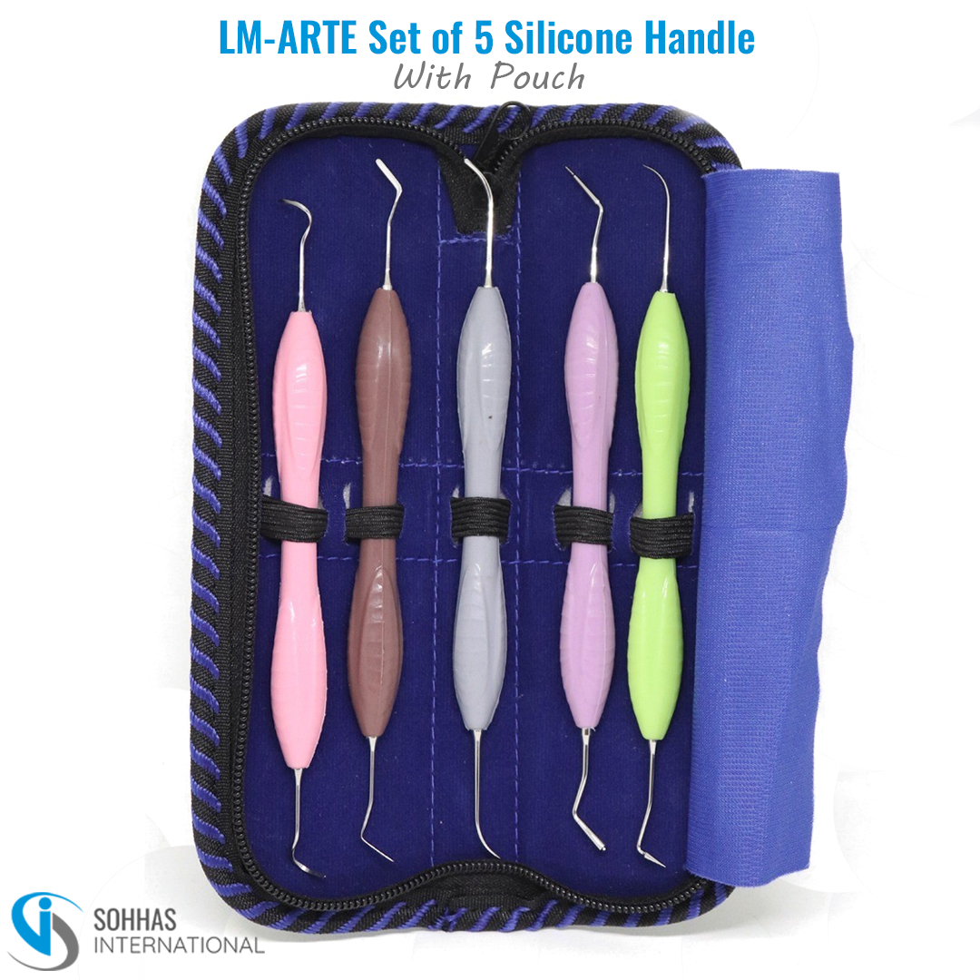 The LM-ARTE Style Composite Filling Instruments Set of 5 with ergonomic silicone handles and a durable leather pouch is expertly designed for advanced aesthetic and restorative dentistry. Inspired by the innovative LM-ARTE technique, each instrument in this set is tailored to a specific stage of composite restoration—offering precision, comfort, and control.